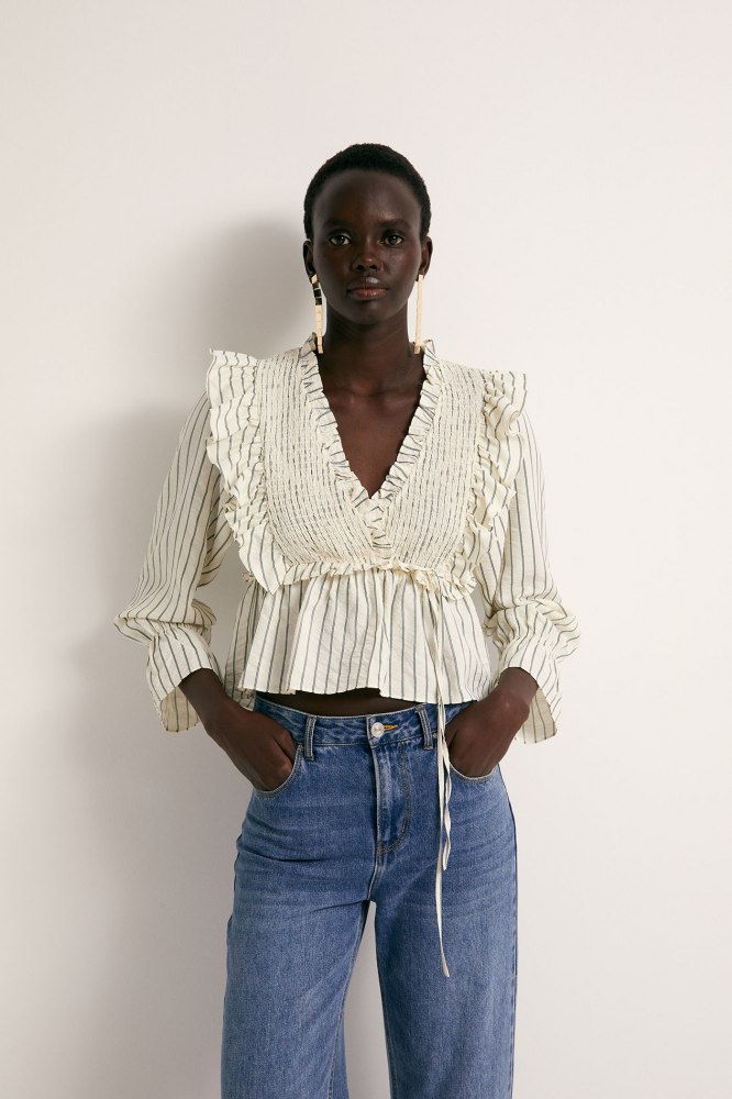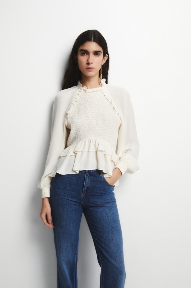 Ruffle-detail shirred blouse
