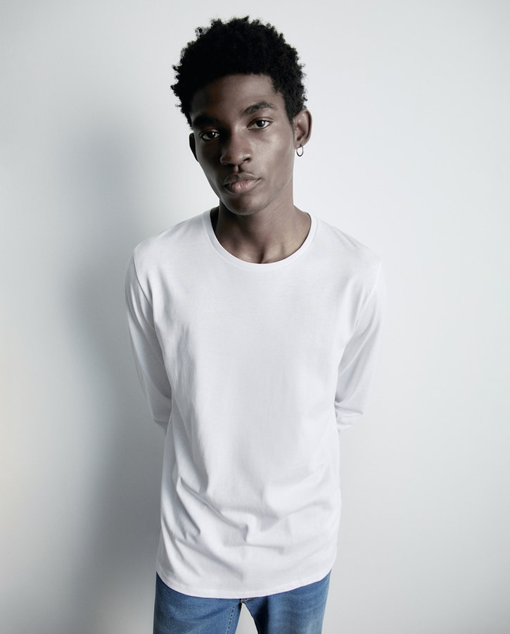 Camiseta básica de manga larga, lisa de color blanco con cuello caja.