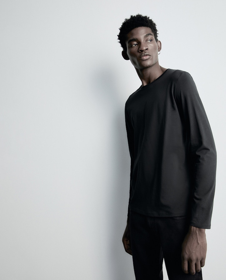 Camiseta de manga larga de color negro. Tiene cuello redondo.