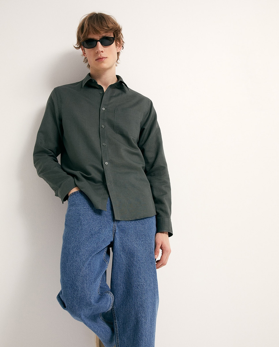 • Camisa en tejido con mezcla de lino y algodón de manga larga con cuello camisero. Cierre frontal de botonadura