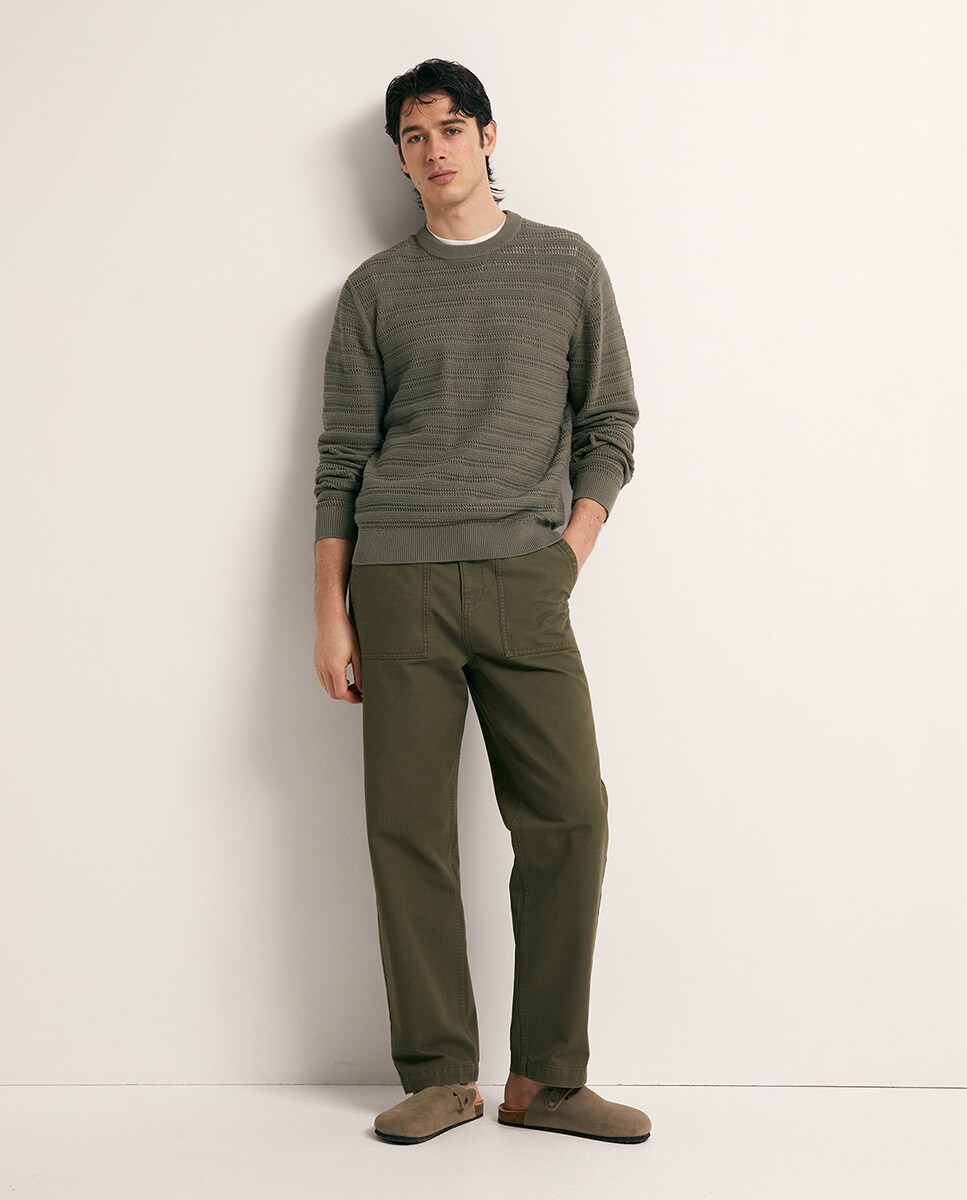 • Pantalón recto con bolsillos delanteros y traseros. Cierre delantero de botón y cremallera. Tejido 100% algodón