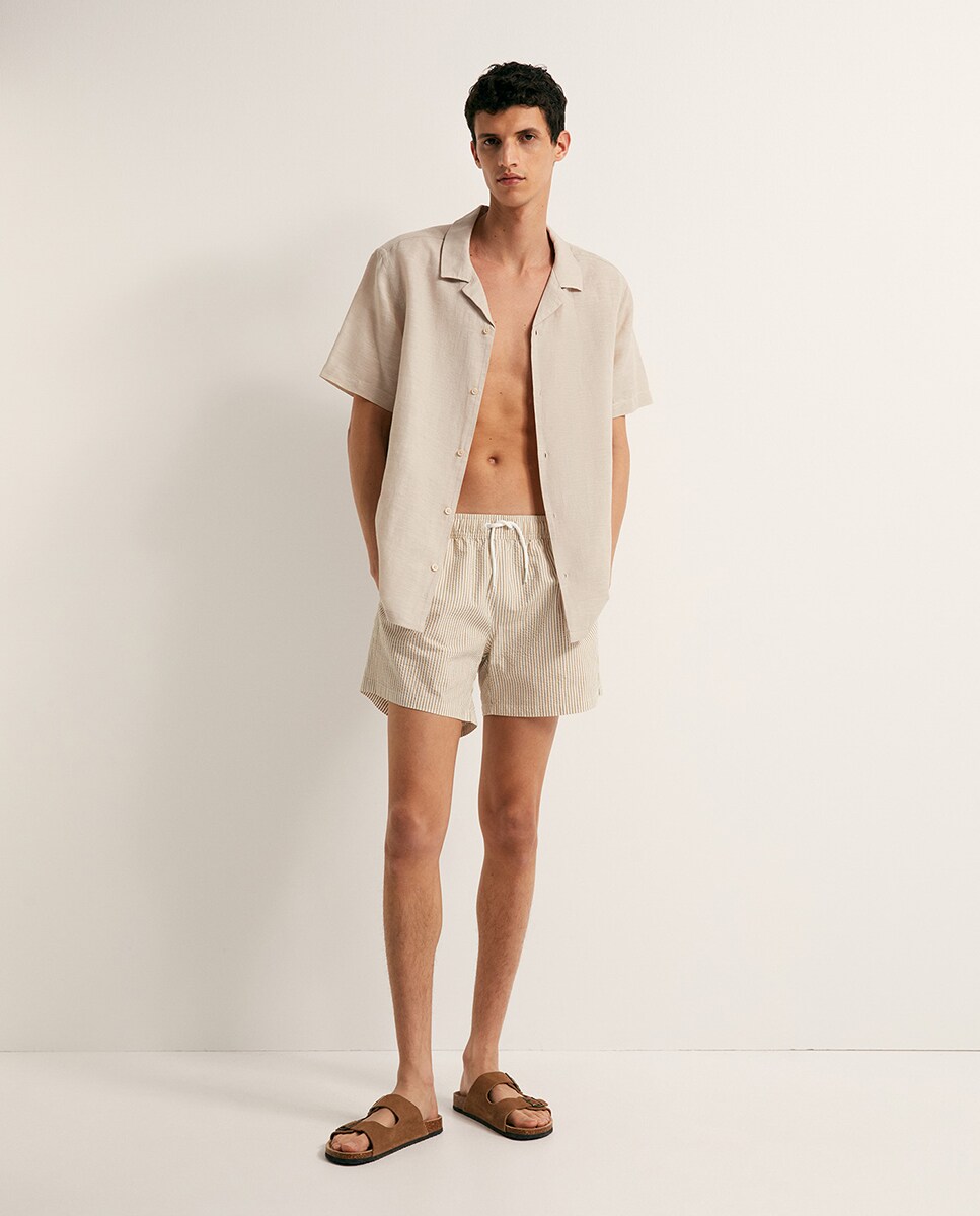 • Bañador de rayas. Goma en cintura con cordón ajustable. Bolsillos delanteros. Forro interior