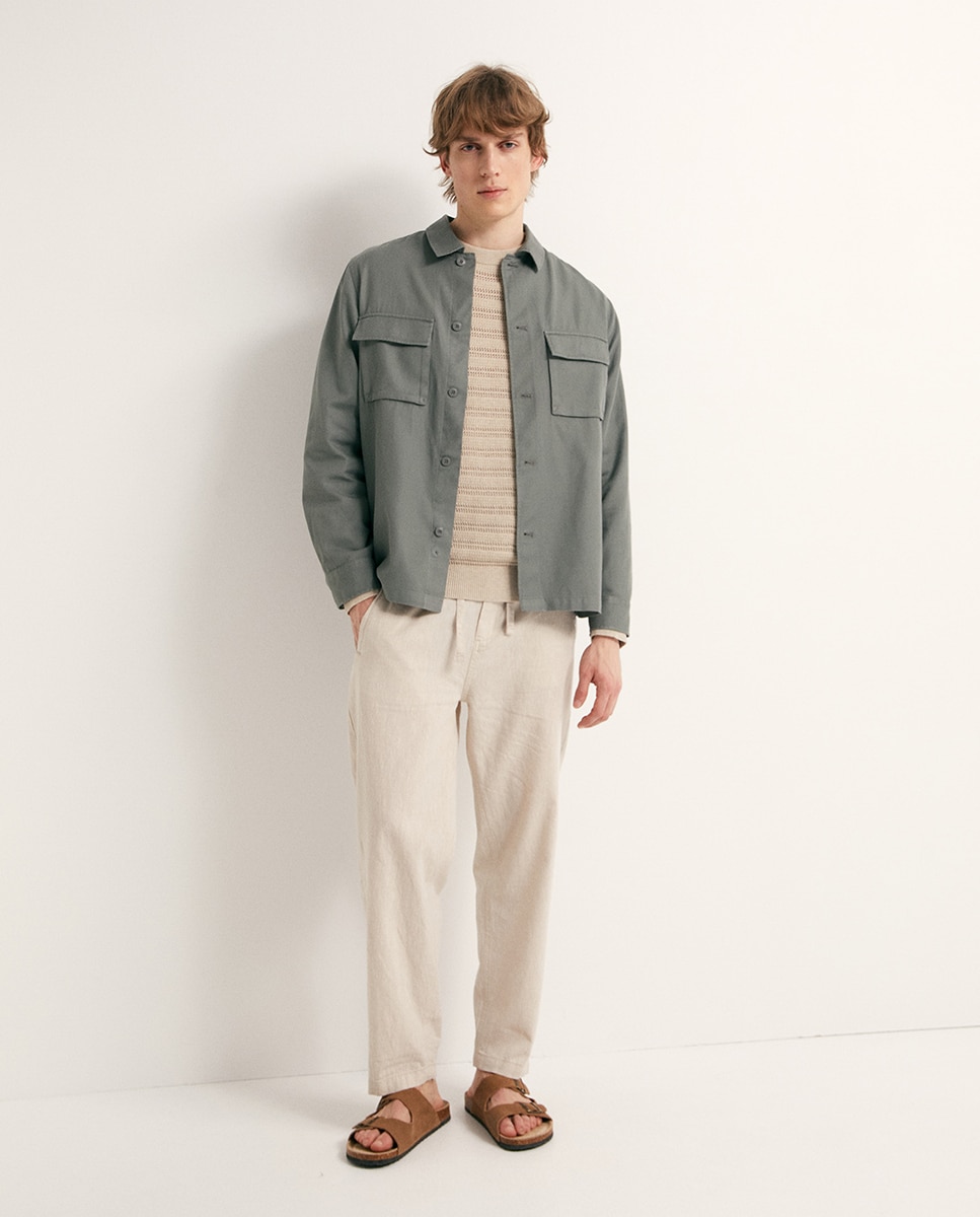 Sobrecamisa con cuello solapa y manga larga acabada en puño con botón. Bolsillos de plastrón con solapa en pecho y cierre frontal de botonadura. Tejido en mezcla de lino y algodón