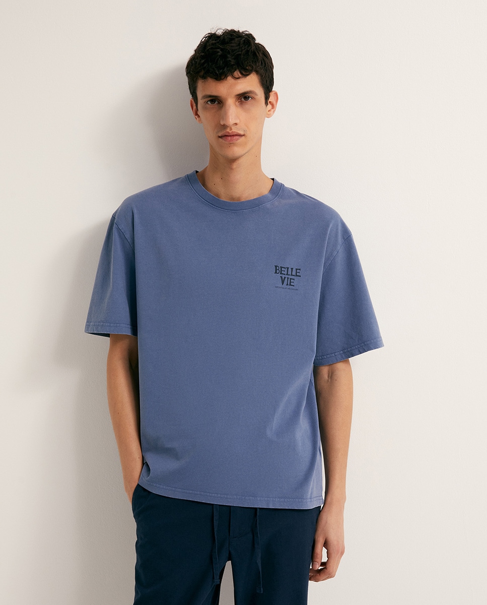 • Camiseta manga corta con cuello caja y detalle de gráfico en espalda y delantera. Tejido 100% algodón