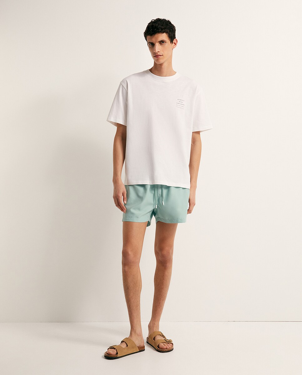 • Bañador en tejido liso. Goma en cintura con cordón ajustable. Forro interior