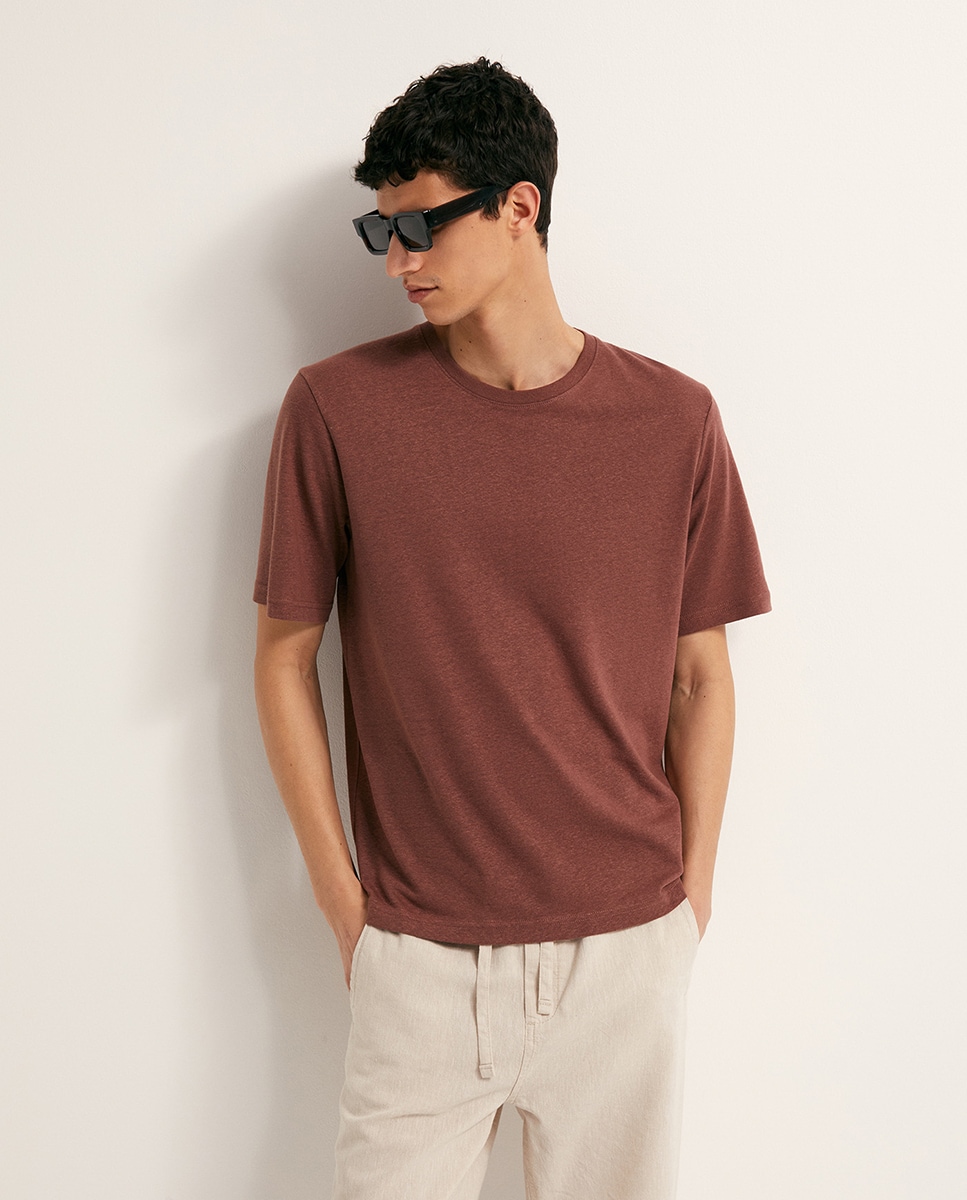• Camiseta de manga corta en mezcla de lino. Fit regular y cuello caja