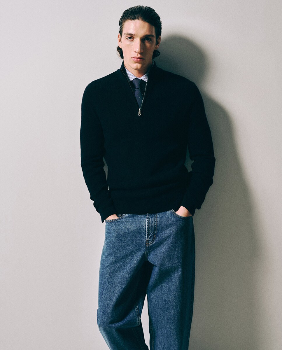 • Jersey estructura de cuello perkins con cierre frontal de cremallera. Manga larga. Acabados en rib