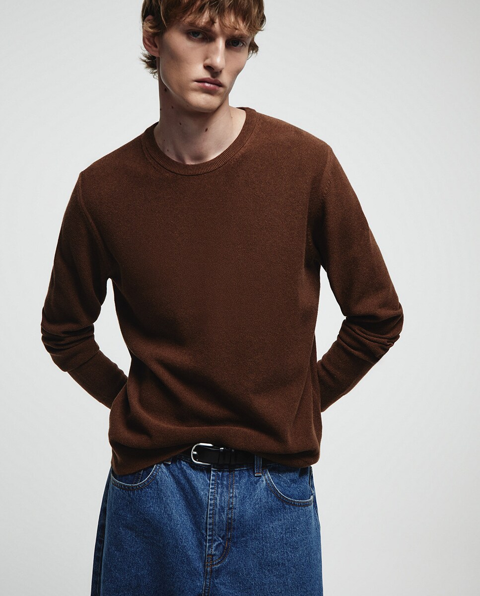 • Jersey cuello redondo y manga larga con acabados en rib. Tejido 100% algodón