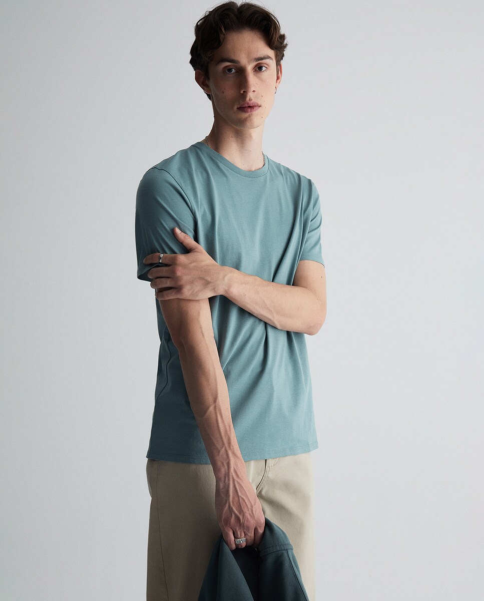 • Camiseta lisa de manga corta y cuello redondo. Algodón 100%