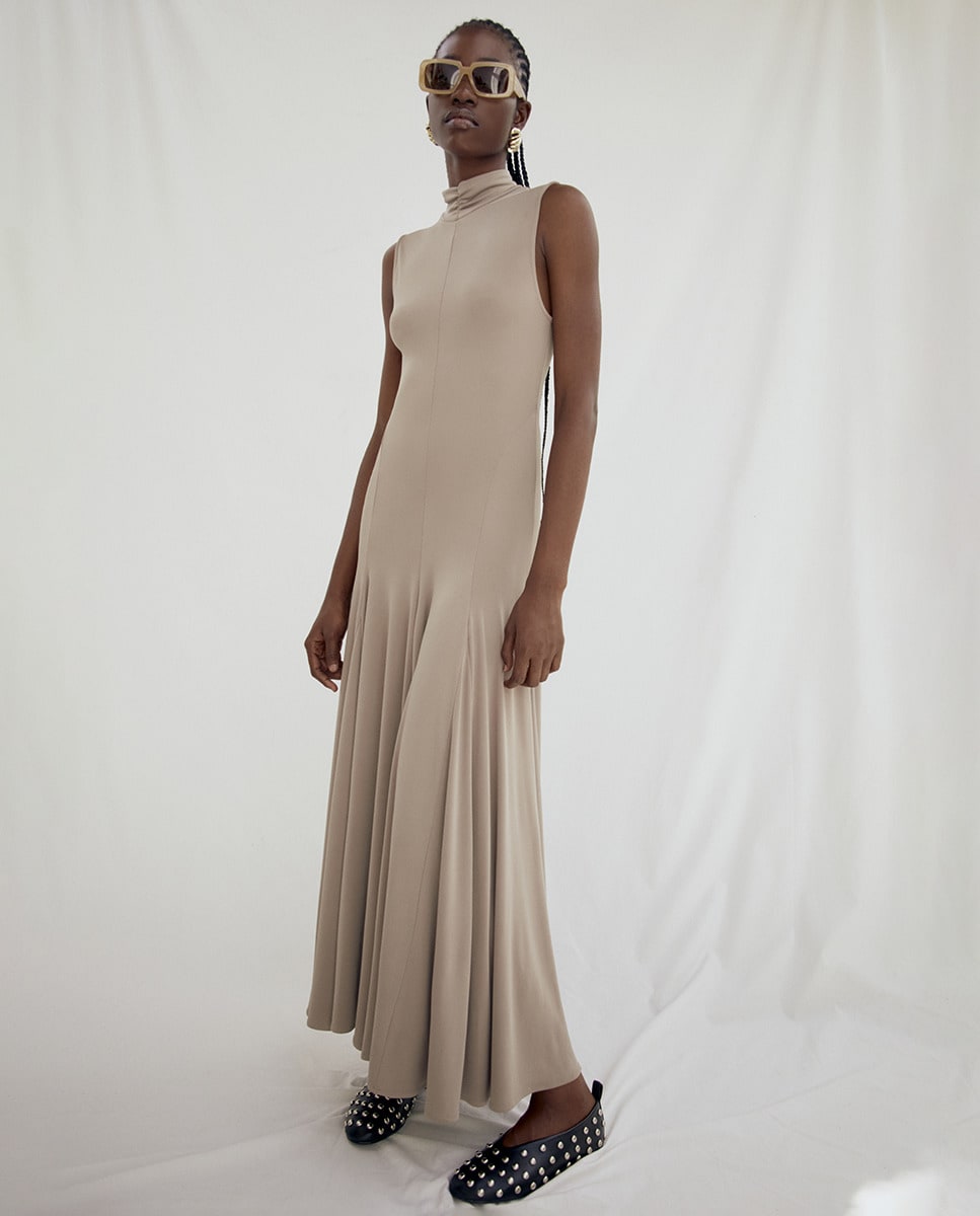 • Vestido liso de vuelo con cuello alto y manga sisa.