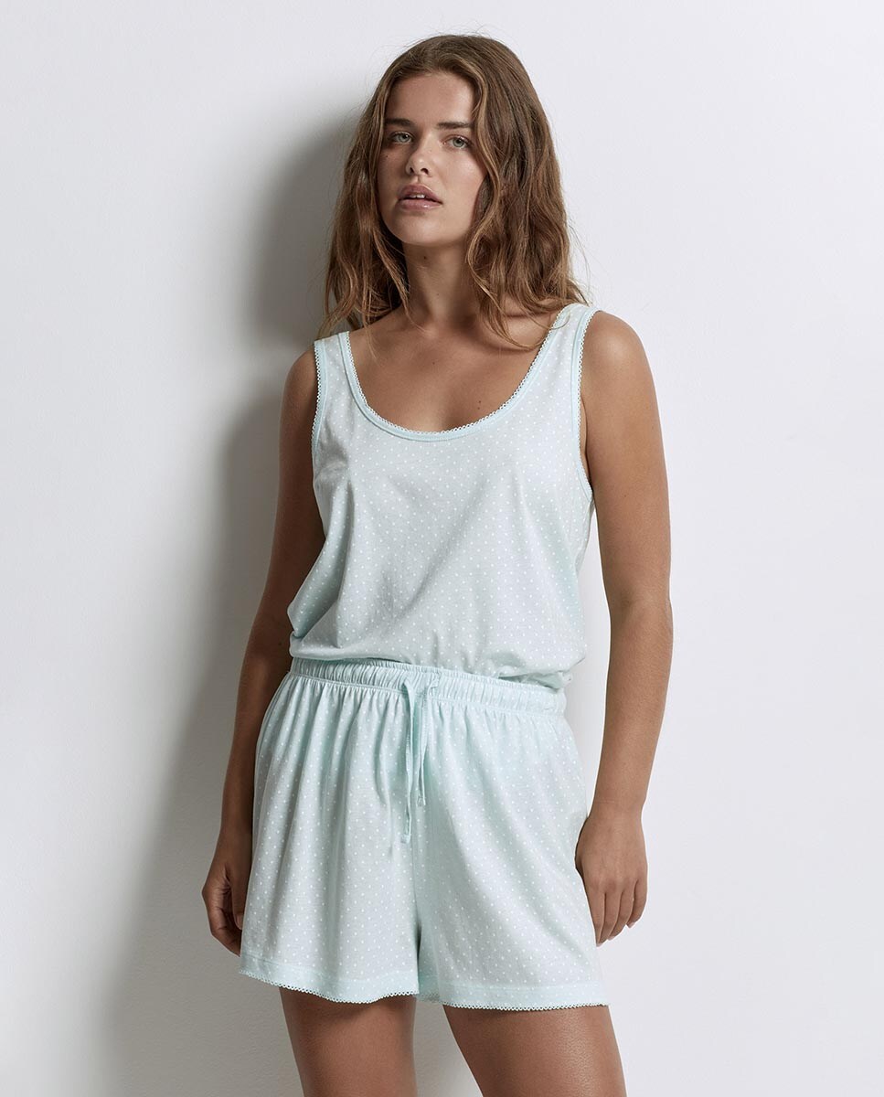 • Pijama de top de tirantes y pantalón corto con estampado de topos. Pantalón con goma y cierre mediante lazada. Algodón 100%