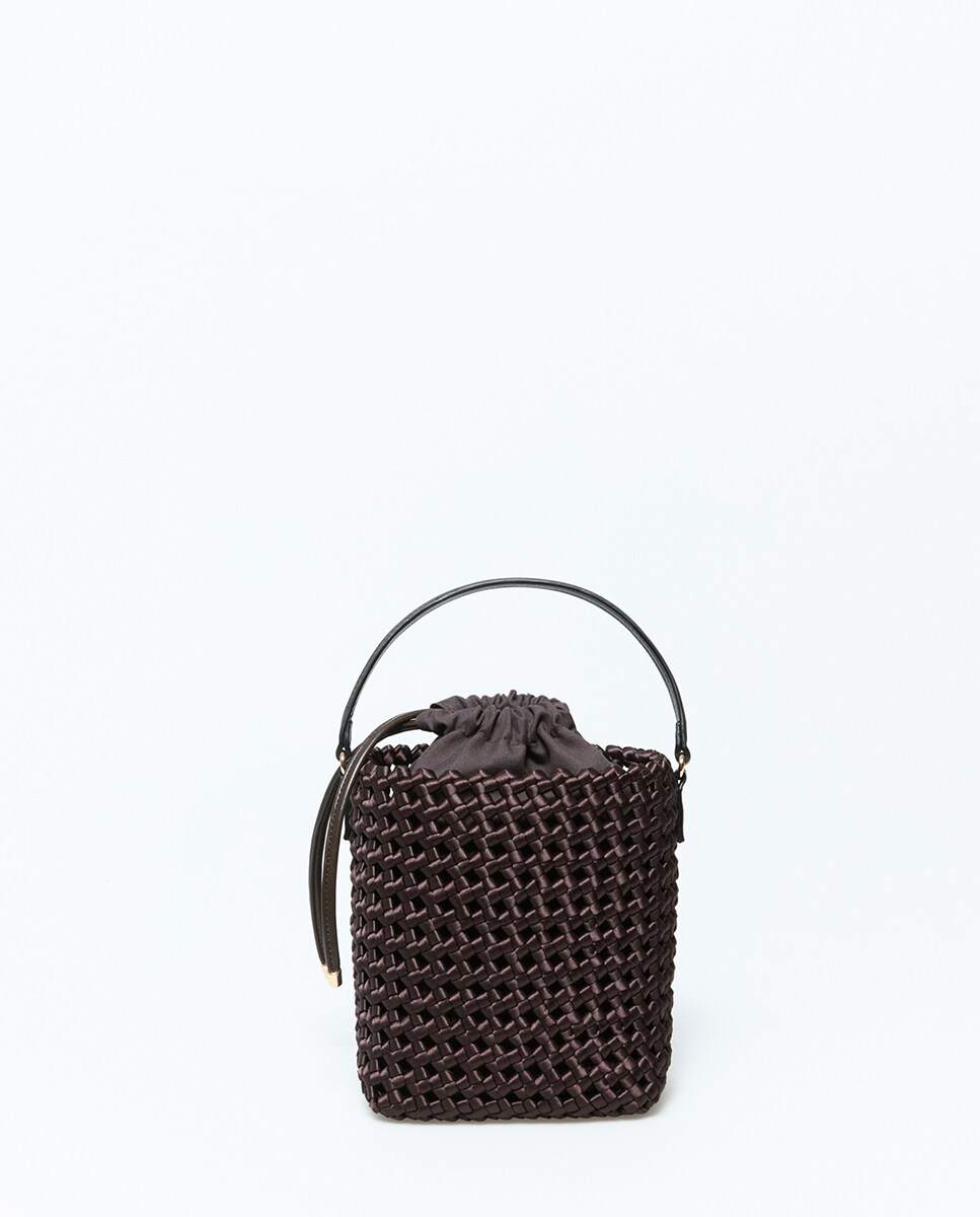 • Bolso tipo cubo con detalle de nudos en satén. Saca interior en tejido y asa corta. 19 x 15 x 10cm