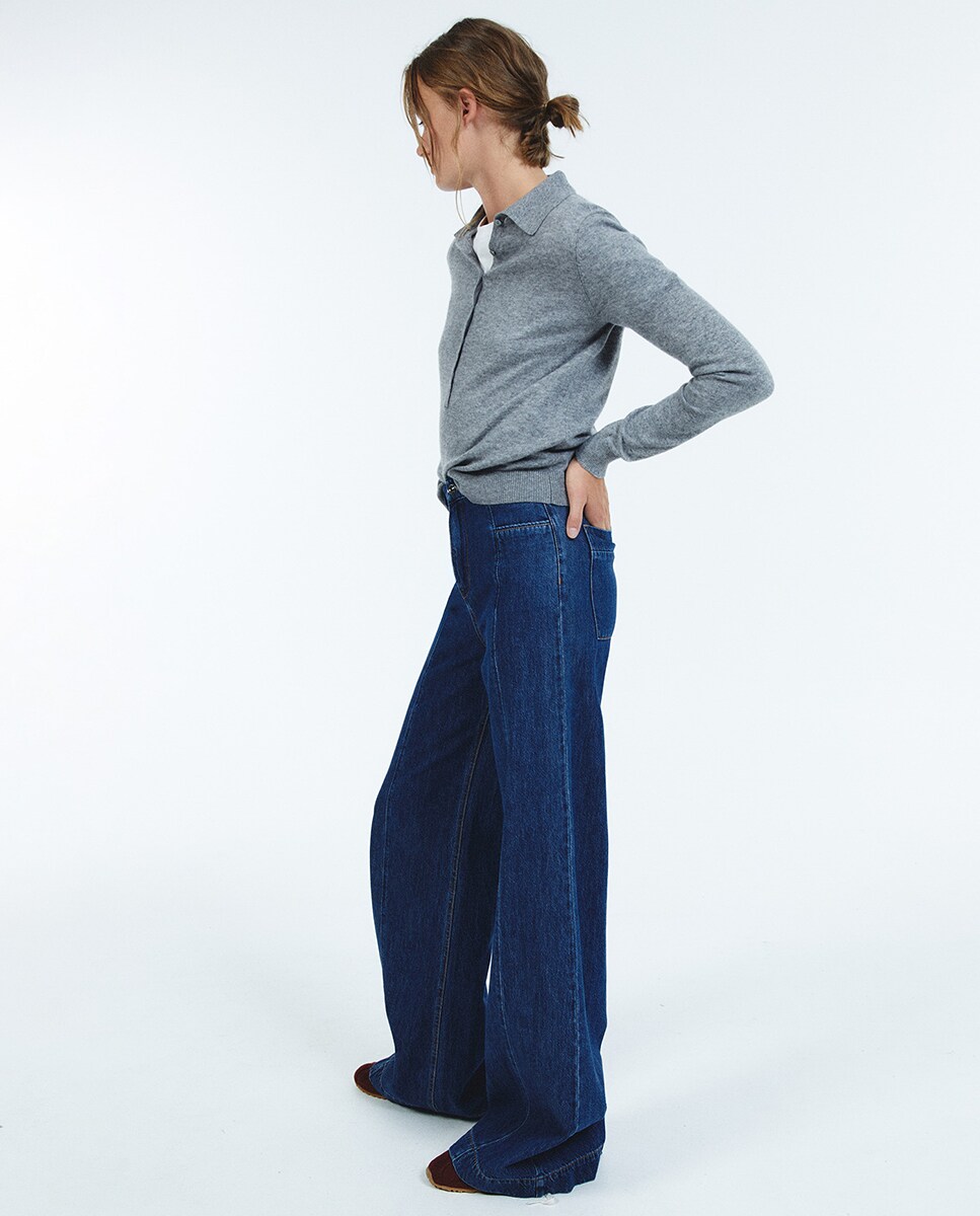 • Pantalón denim ancho con campana. Bolsillos y cierre de cremallera oculta y botón. Algodón 100%