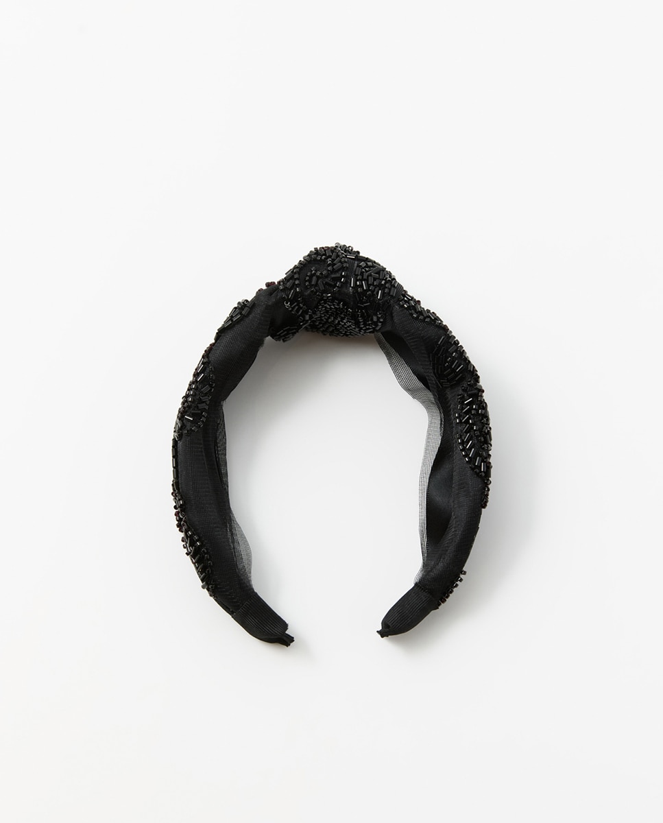 • Diadema ancha bordada con cuentas y tul. Detalle de nudo