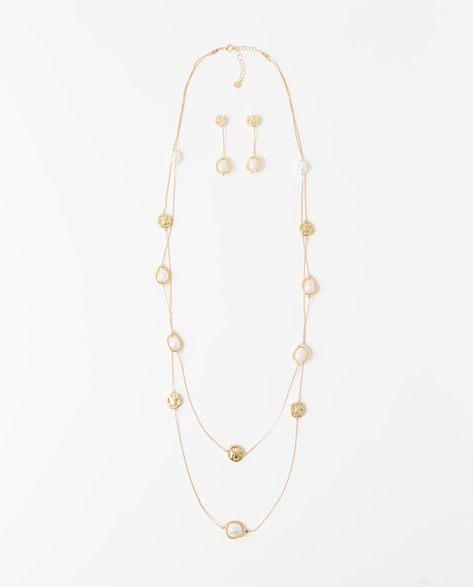 • Set de collar doble cadena metalizado con detalle de perlas y pendientes a conjunto