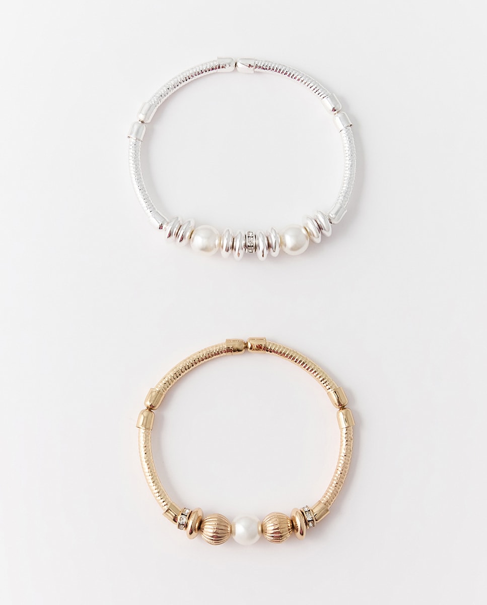 • Set de 2 pulseras metalizadas con detalle de perlas
