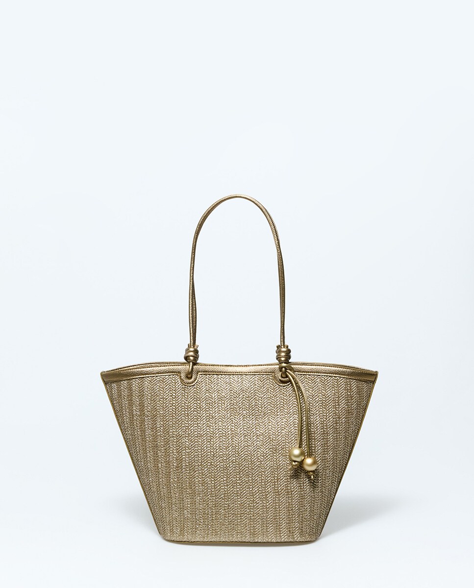 • Bolso tipo capazo en rafia con acabado metalizado. Detalle de llavero con cuentas. 29 x 25 x 13
