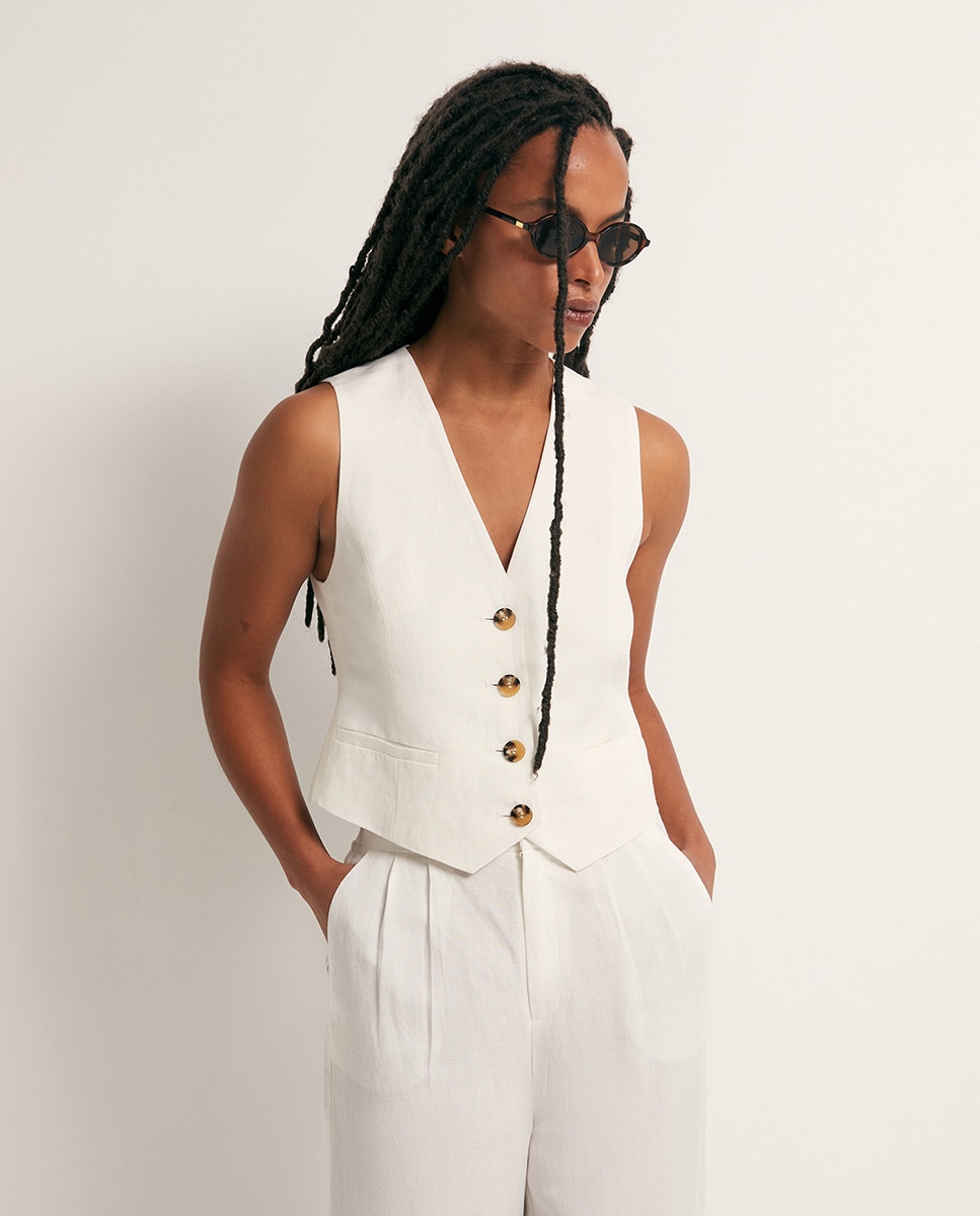 • Chaleco mezcla lino con cierre de botones y detalle ajustable en la espalda