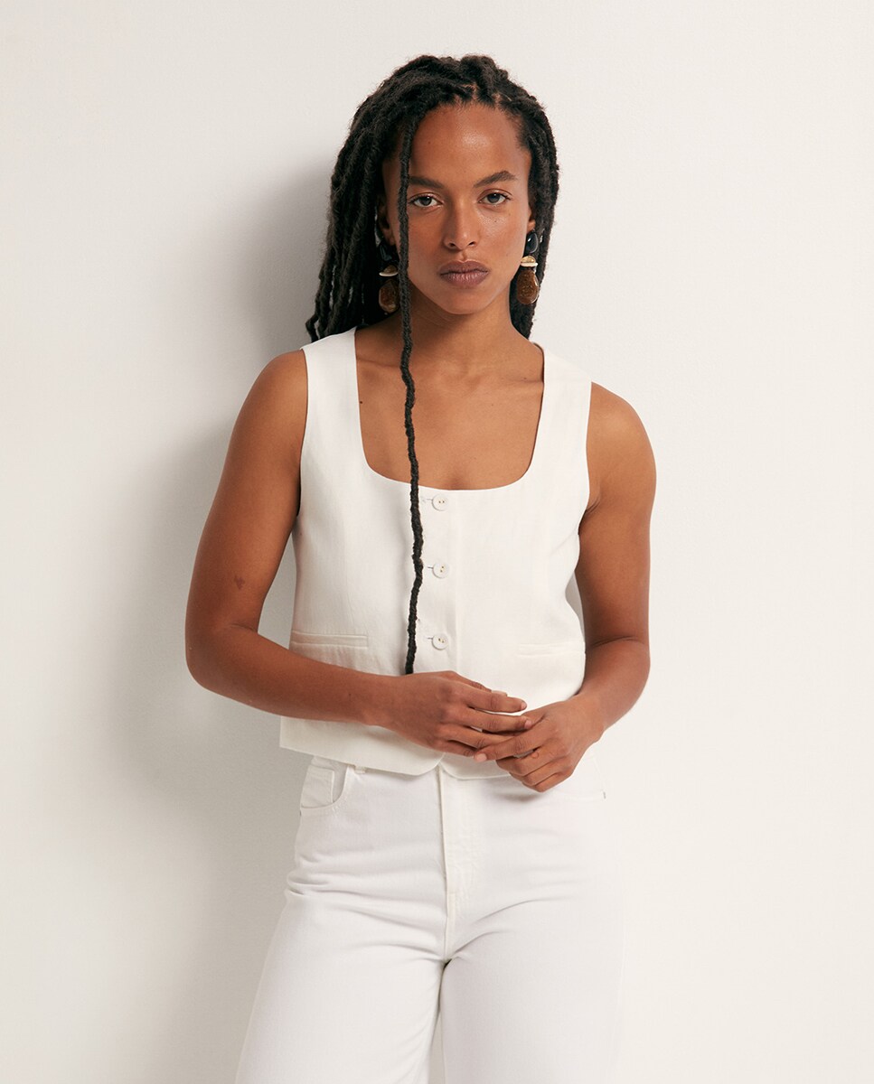 • Chaleco de escote redondo con cierre de botones. Mezcla en lino