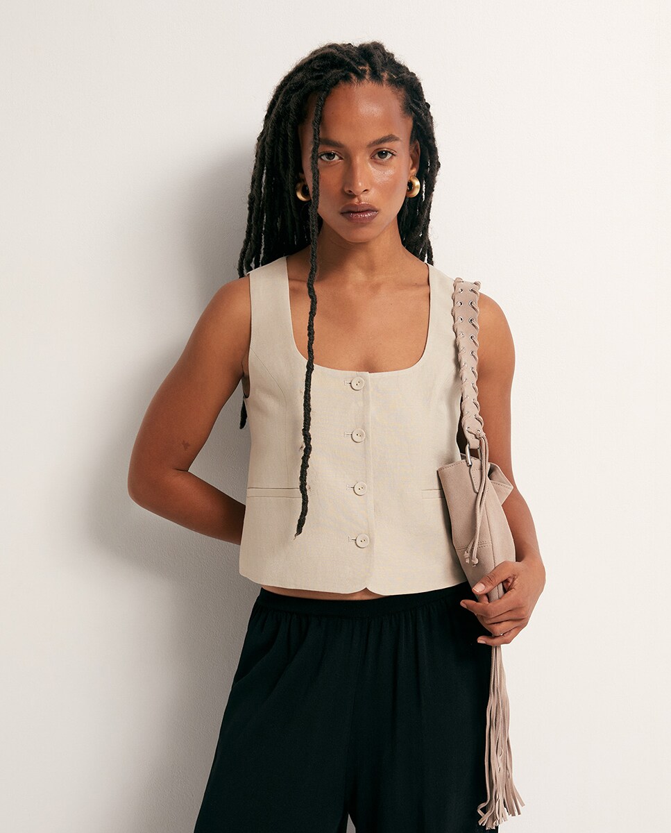 • Chaleco de escote redondo con cierre de botones. Mezcla en lino