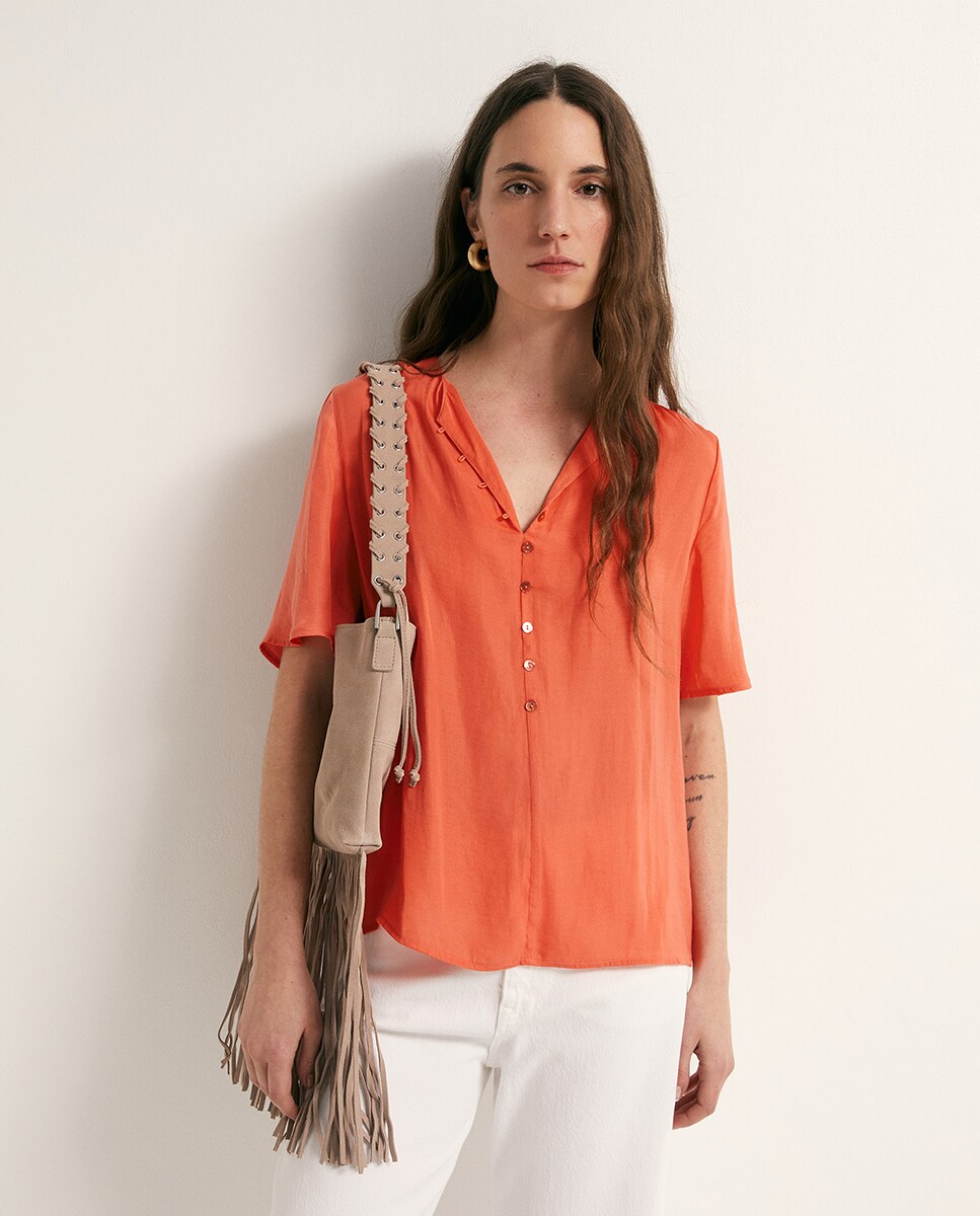 • Blusa lisa de manga corta con cuello pico