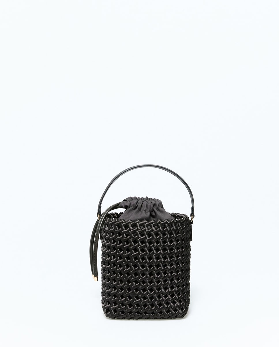 • Bolso tipo cubo con detalle de nudos en satén. Saca interior en tejido y asa corta. 19 x 15 x 10cm