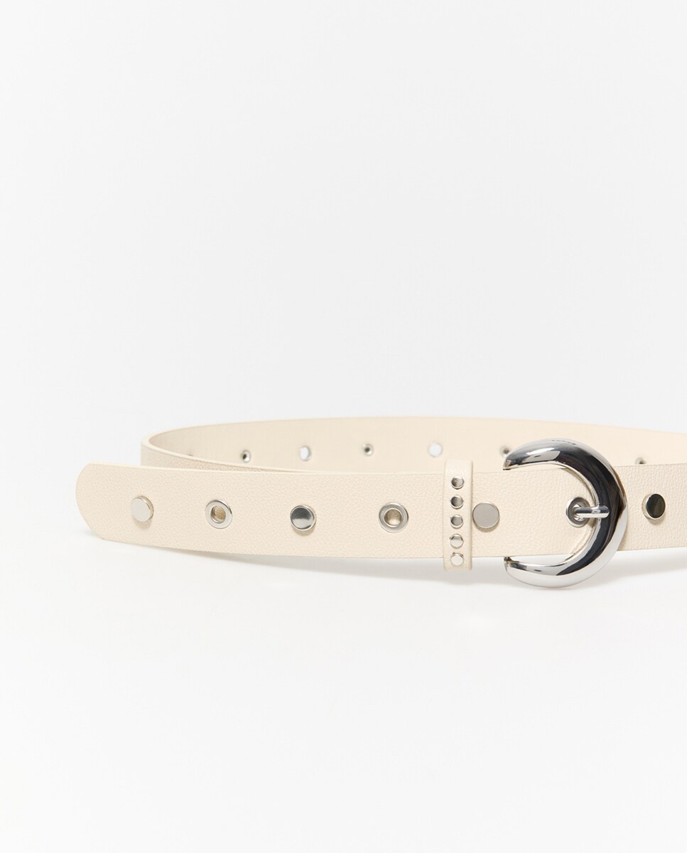 • Cinturón liso con detalle de tachas y ojales. Cierre de hebilla metálica