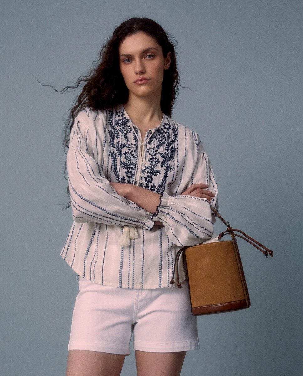 • Blusa con cuello mao y manga abullonada con detalles bordados. Cierre de lazada con detalle de pompón