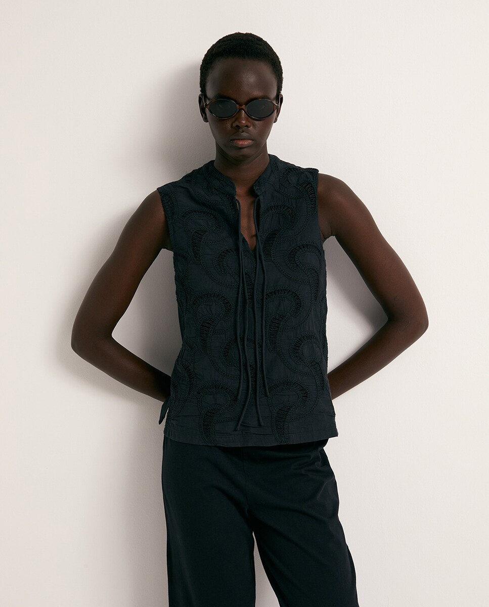 • Top bordado sin mangas con cuello mao y detalle de lazadas