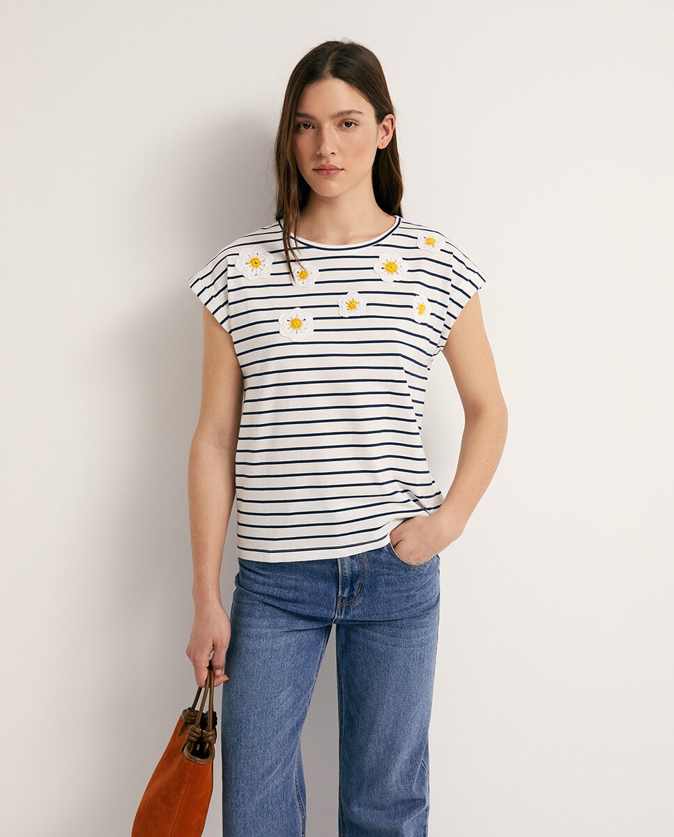 • Camiseta de manga corta en algodón con cuello caja. Detalle de crochet en delantero. Algodón 100%