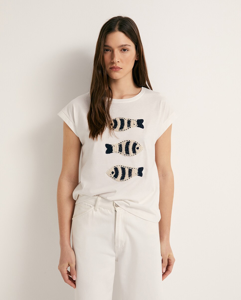 • Camiseta de manga corta en algodón con cuello caja. Detalle de crochet en delantero. Algodón 100%