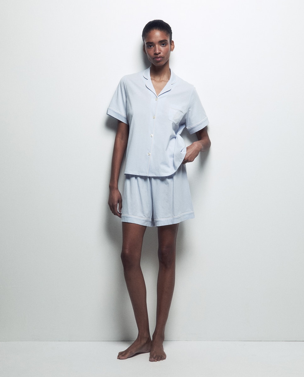 • Pijama corto con cuello solapa y detalle de bolsillo bordado. Pantalón con goma en la cintura. Algodón 100%