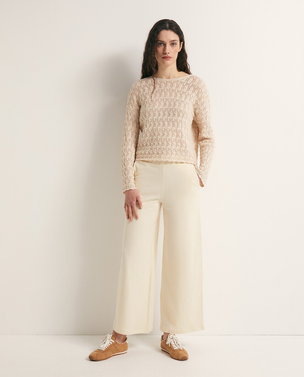 • Pantalón pernera amplia con goma en cintura y bolsillos