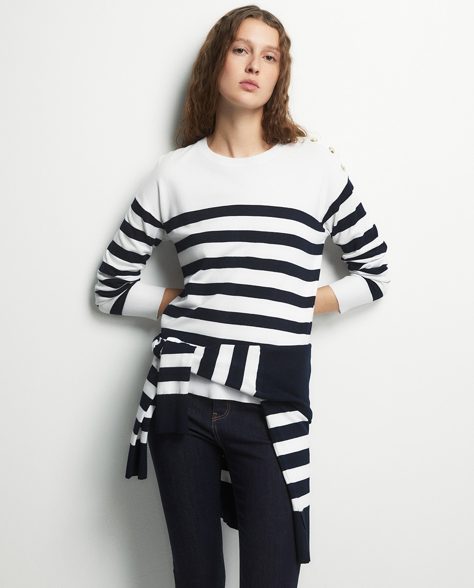 • Jersey con cuello redondo y manga larga estampado de rayas. Detalle de botones en hombro
