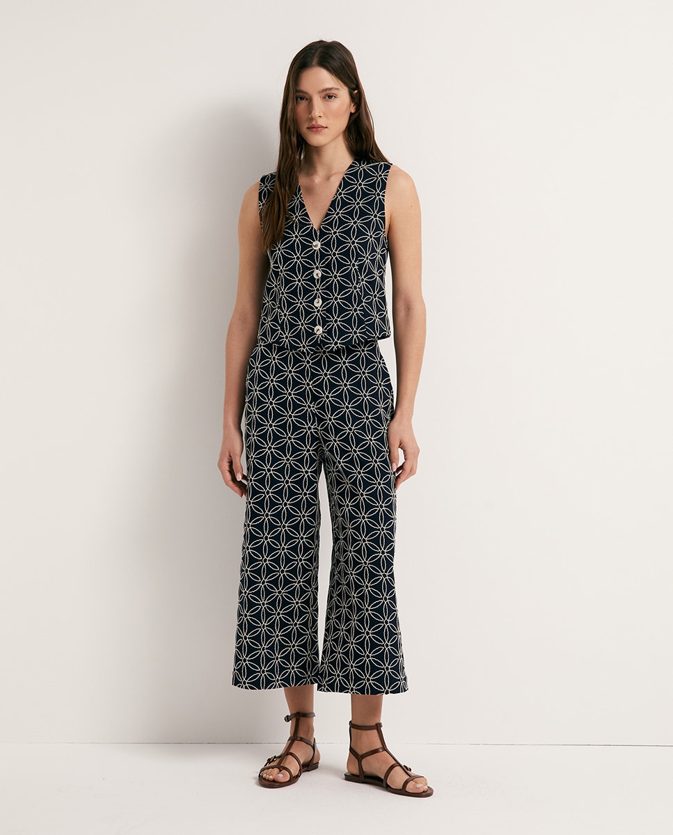 • Pantalón cropped en lino con bordados. Bolsillos laterales