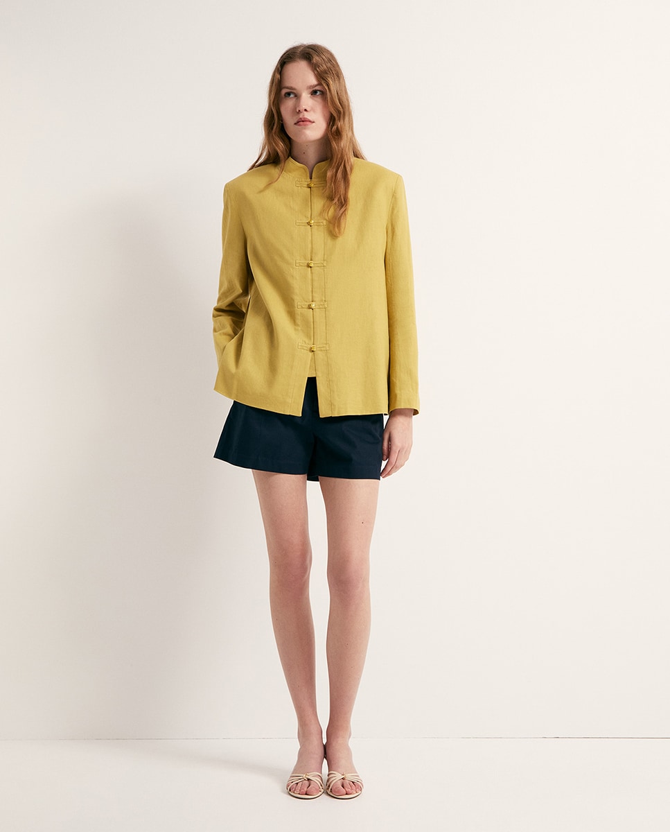 • Short liso de cintura alta con costuras delanteras. Cierre de corchete escondido y cremallera. Algodón 100%