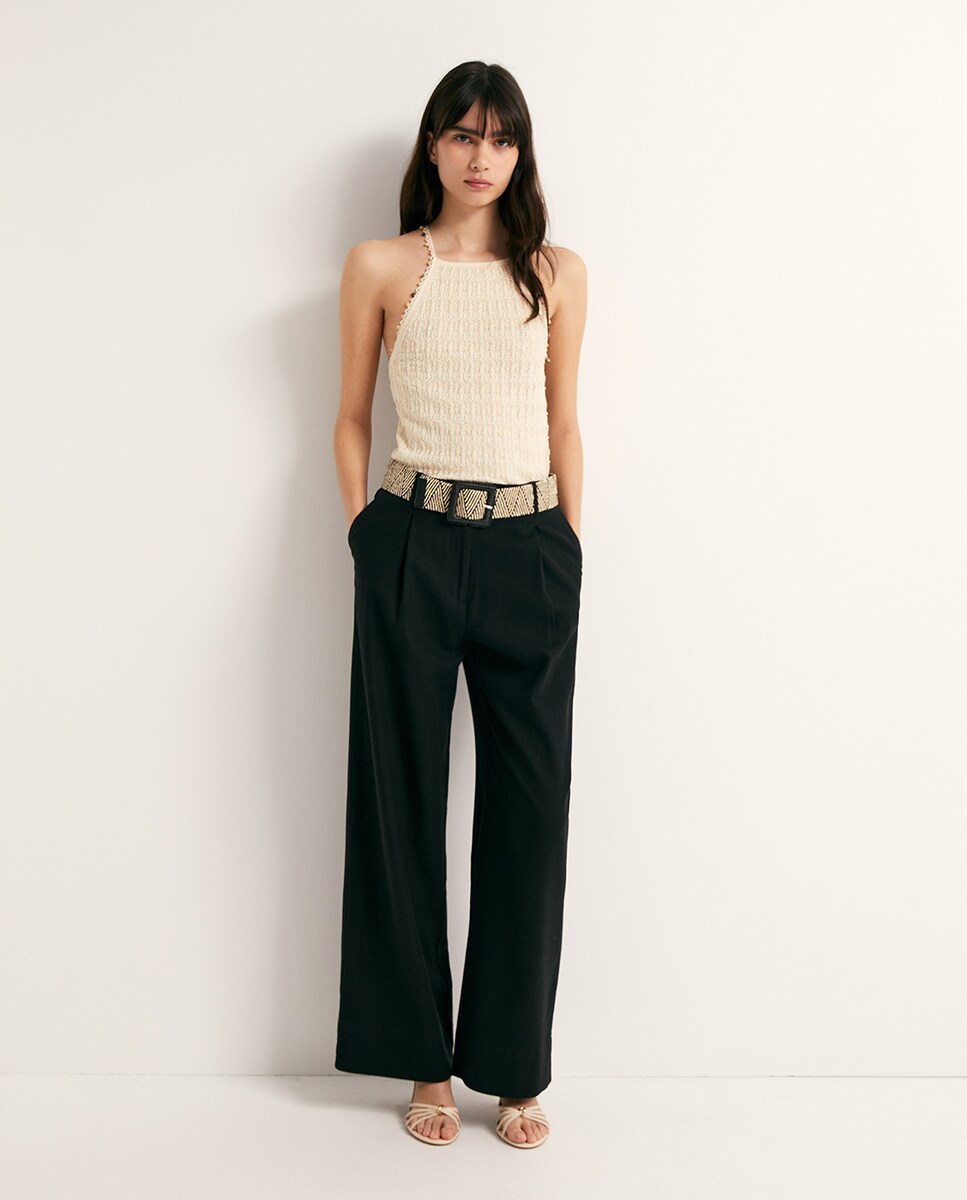 • Pantalón fluido de pinzas con bolsillos laterales. Cinturón trenzado ancho. Cierre de botón y cremallera