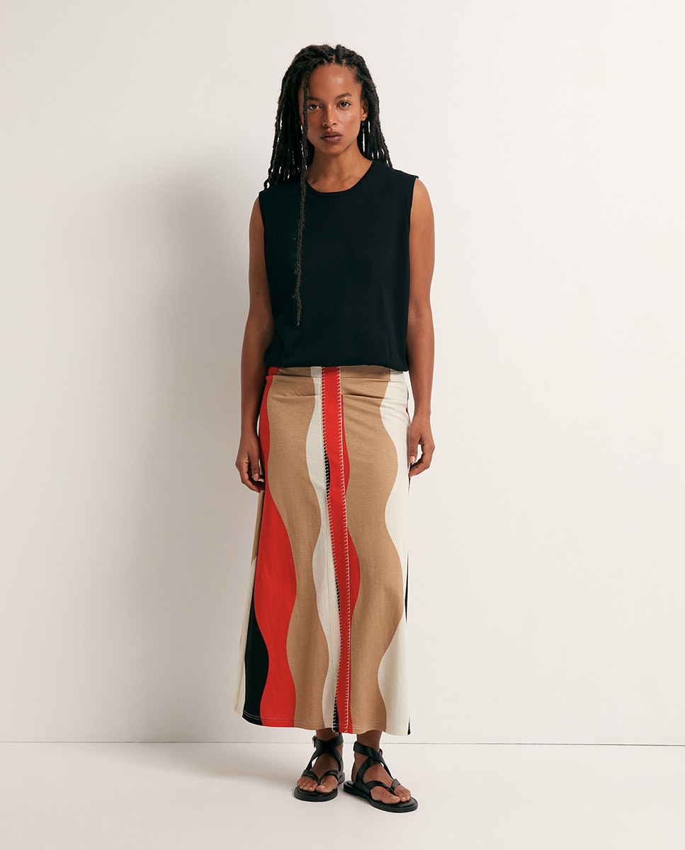 • Falda larga bicolor estampada. Pespunte con abertura central. Cremallera invisible lateral