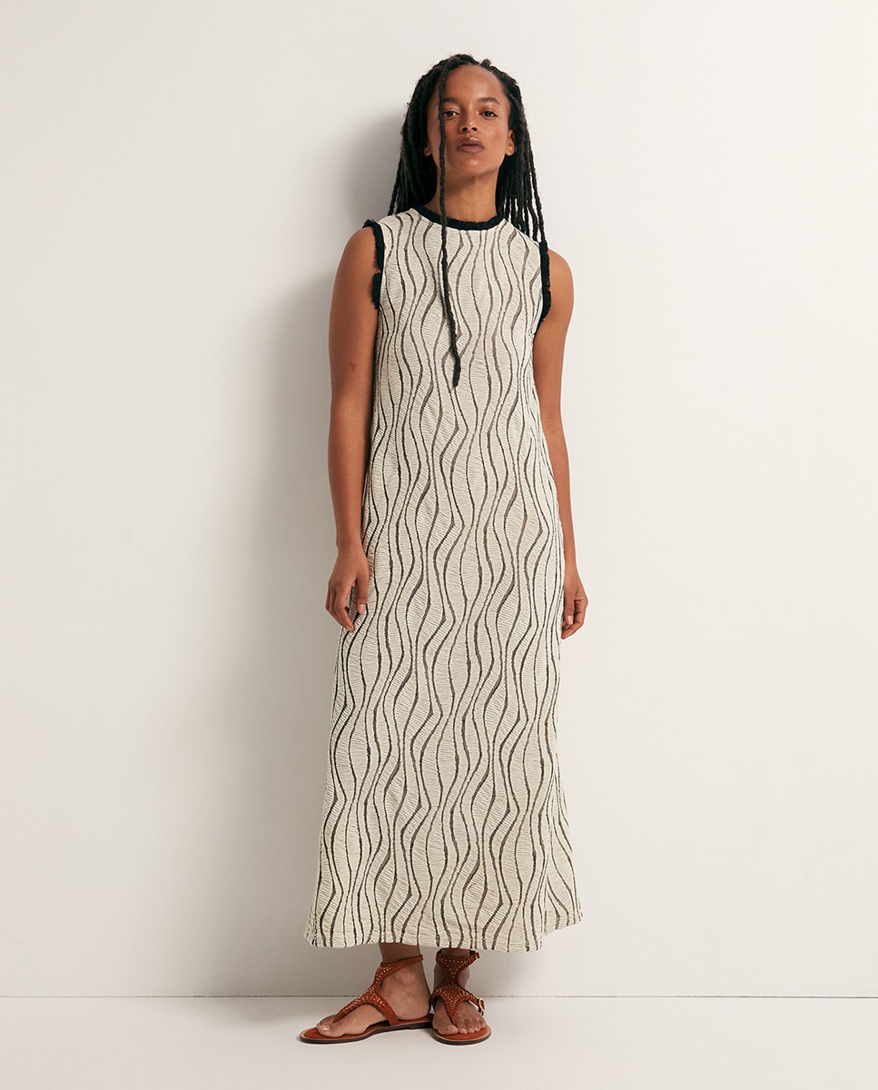 • Vestido largo estampado con cuello redondo y manga sisa. Detalle de flecos