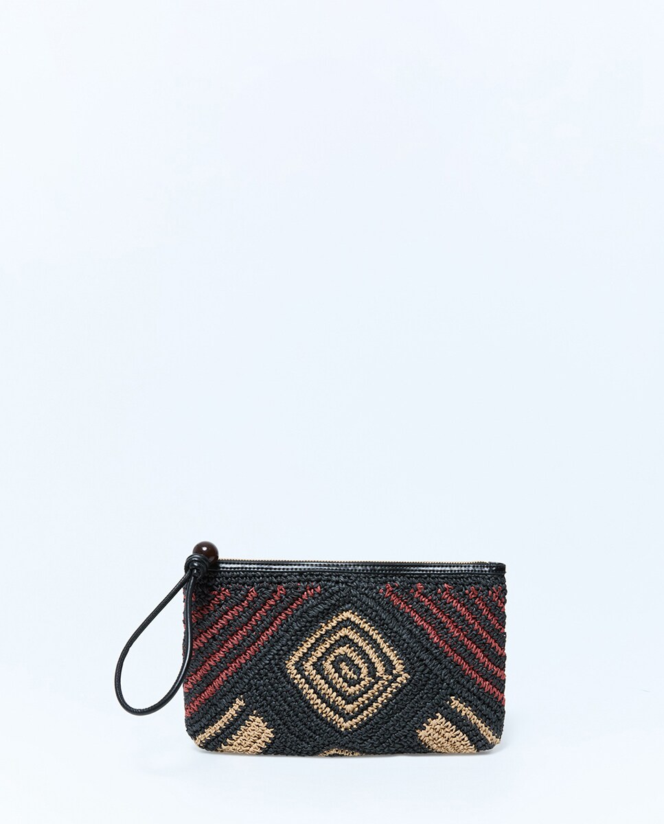 • Cartera de rafia con dibujo y cierre de cremallera