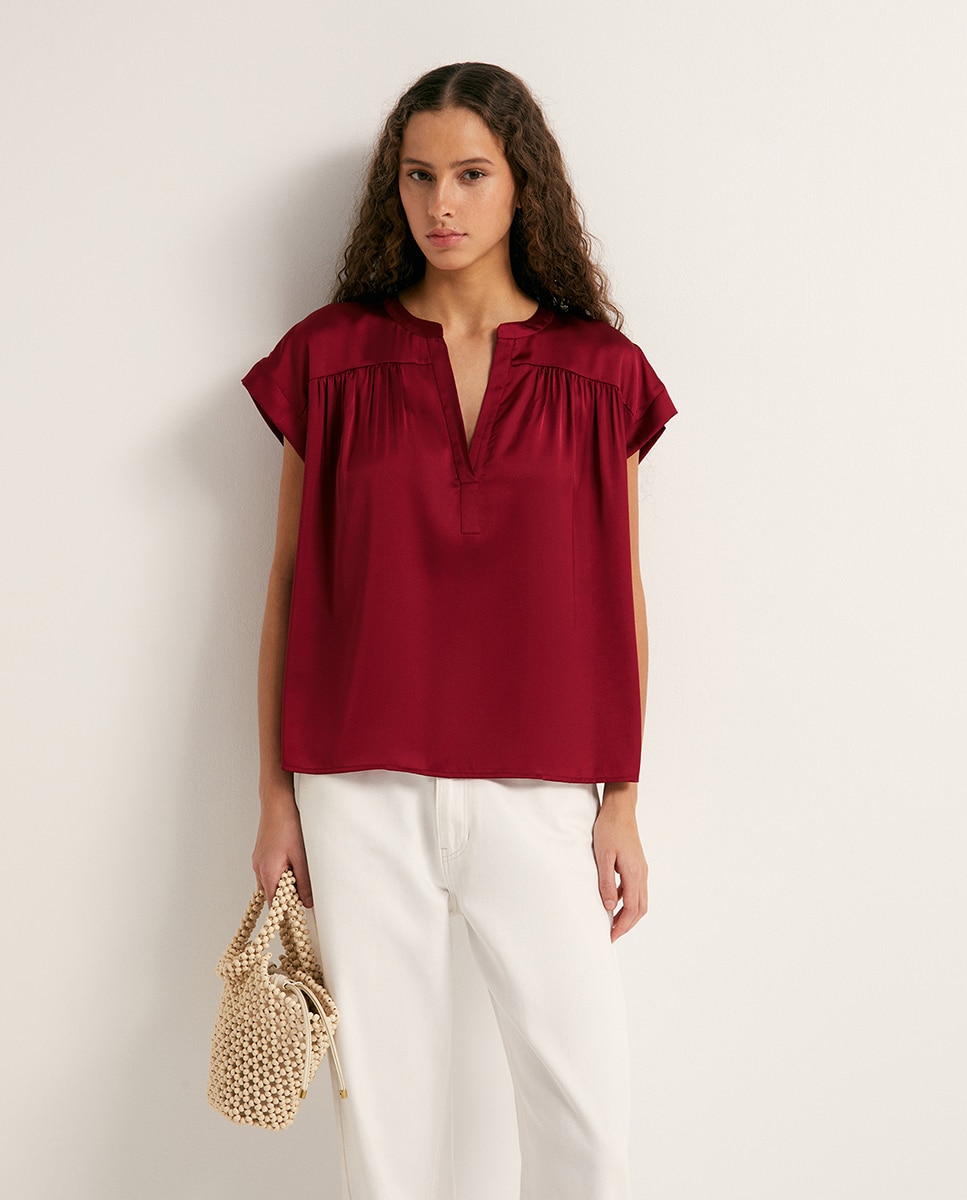 • Top en tejido satinado con manga corta y cuello pico con detalle de frunces