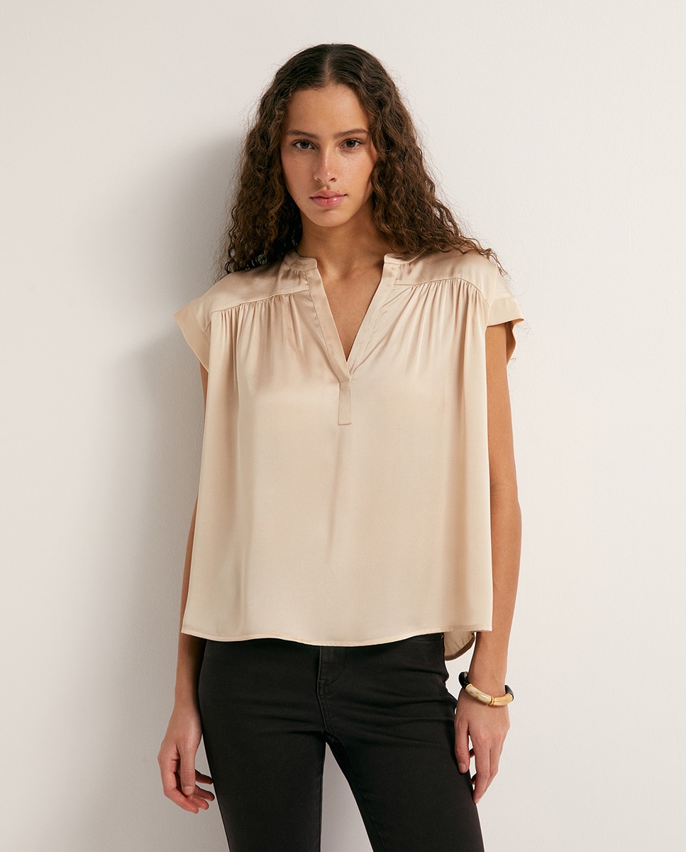 • Top en tejido satinado con manga corta y cuello pico con detalle de frunces