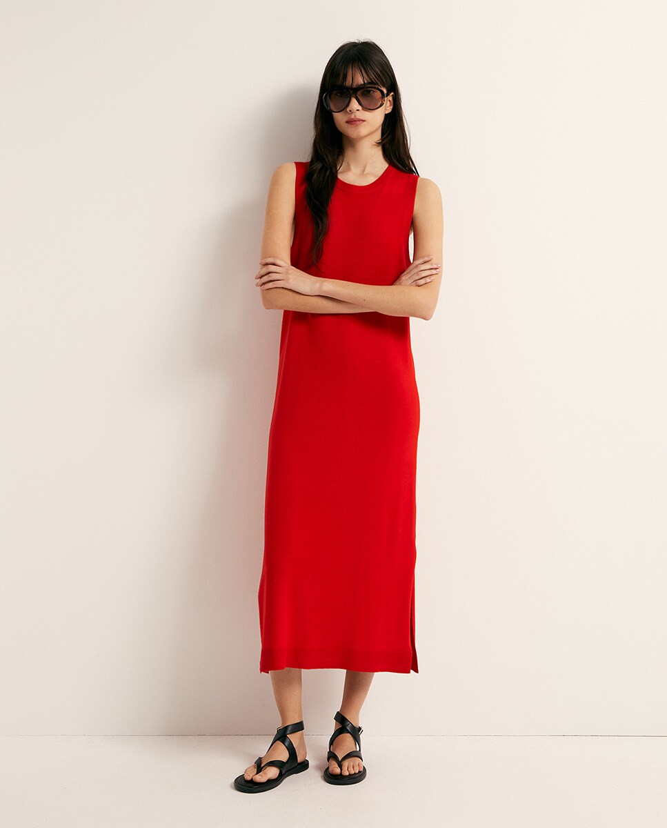 • Vestido liso de punto con manga sisa y cuello redondo. Aberturas laterales en bajo