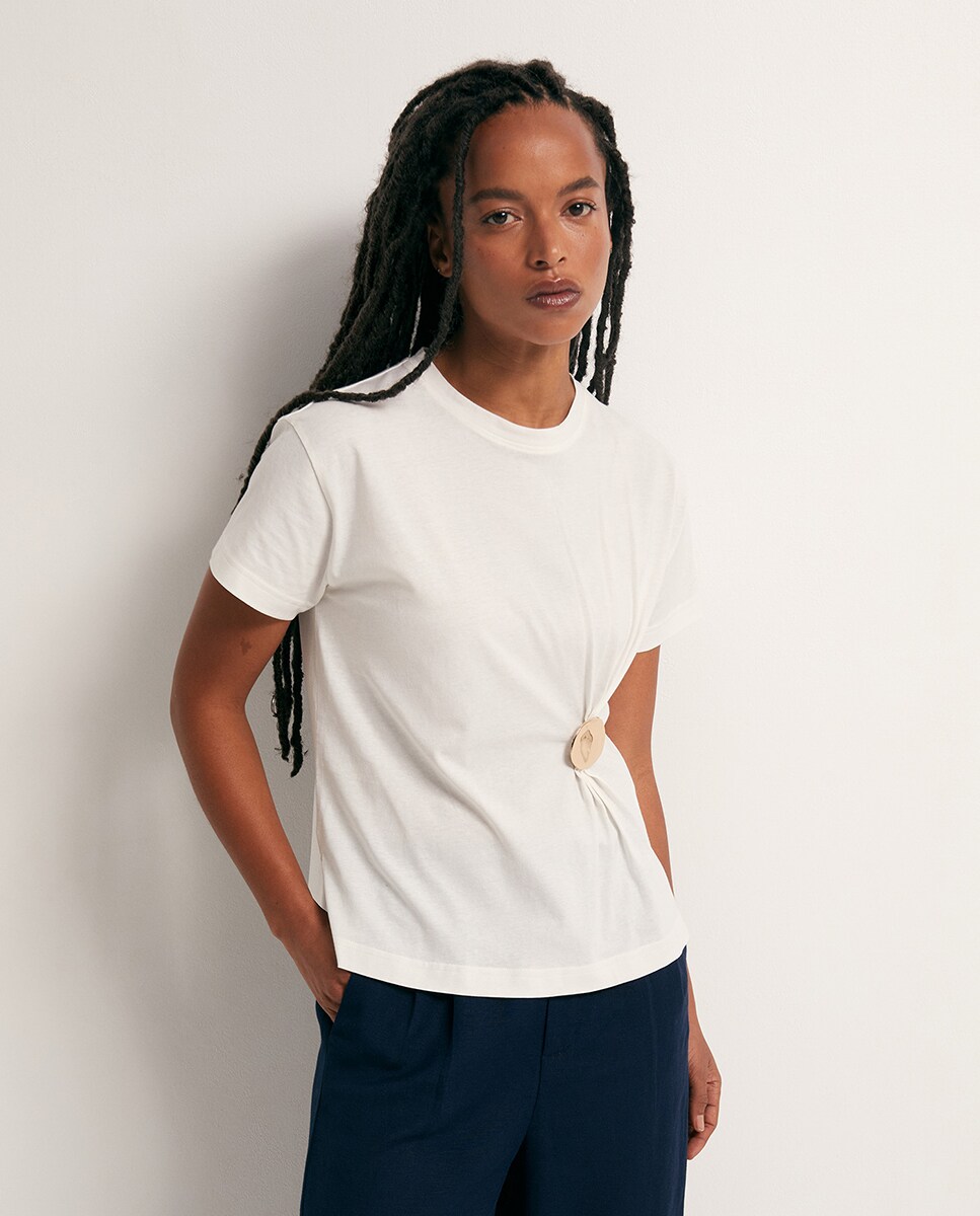 • Camiseta lisa de manga corta con detalle de drapeado y pieza metálica. Algodón 100%