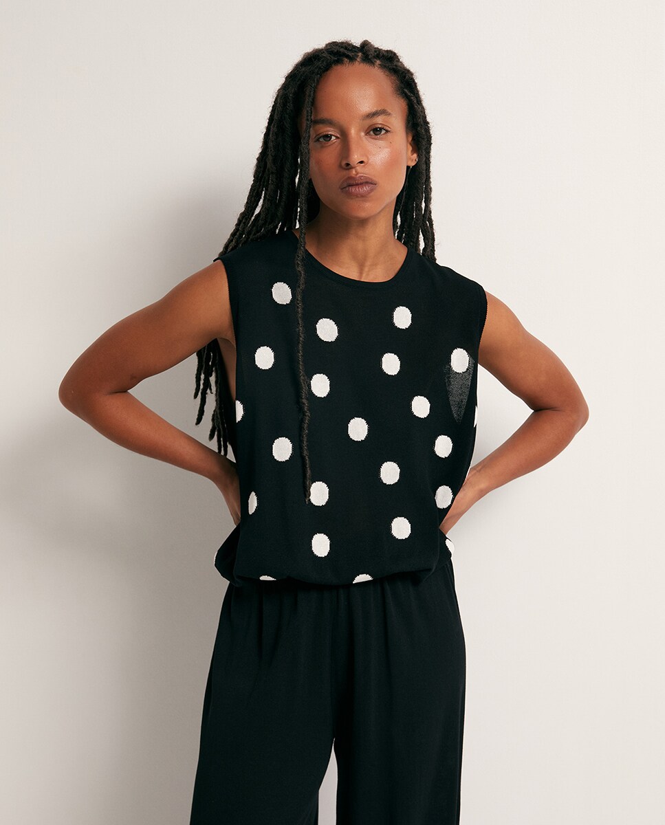 • Top con manga sisa y cuello redondo estampado de lunares. Bajo abullonado