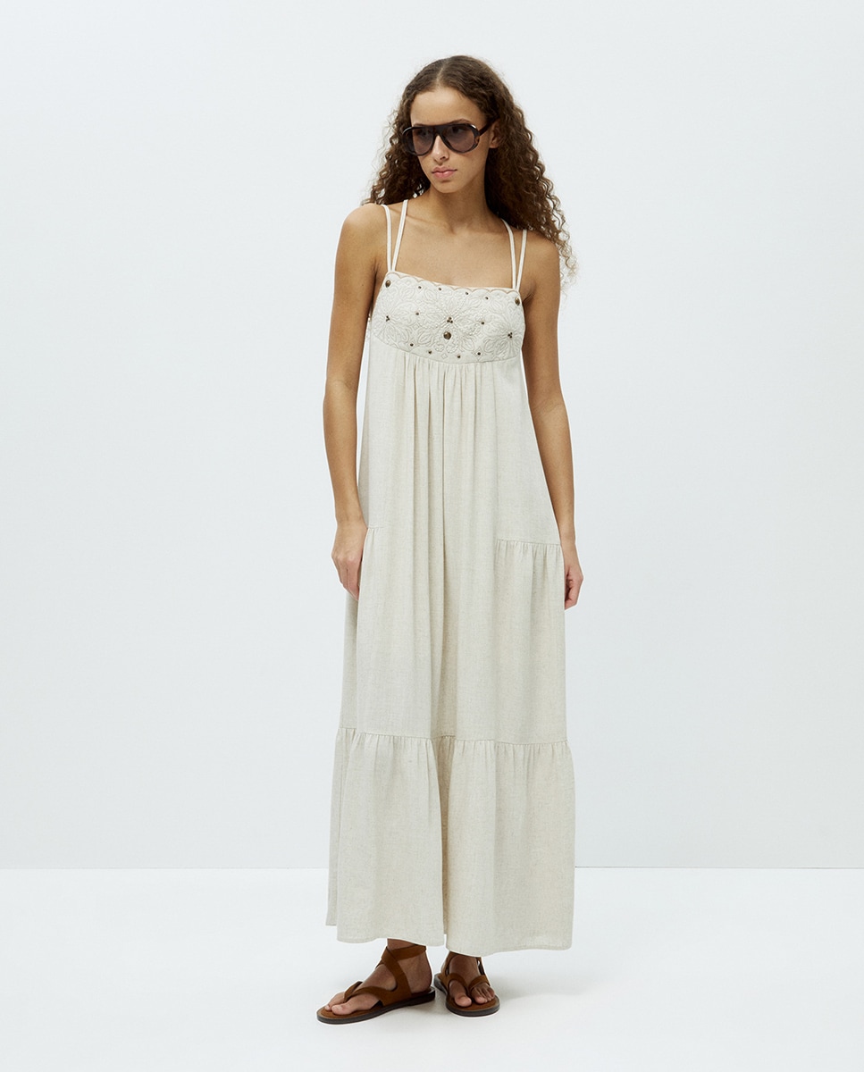 • Vestido largo de tirantes con bordado en pechera