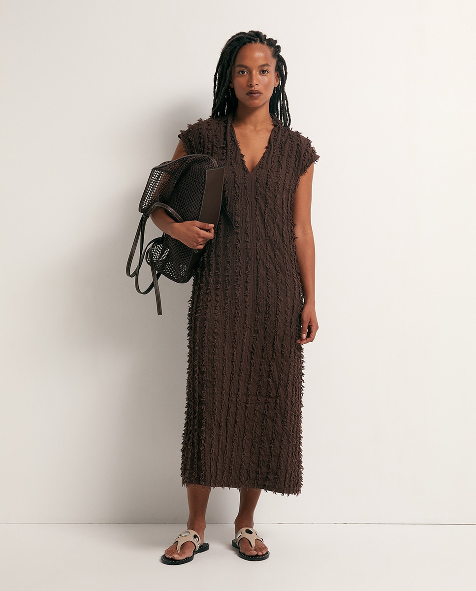 • Vestido midi con manga corta y escote en V con detalle de flecos