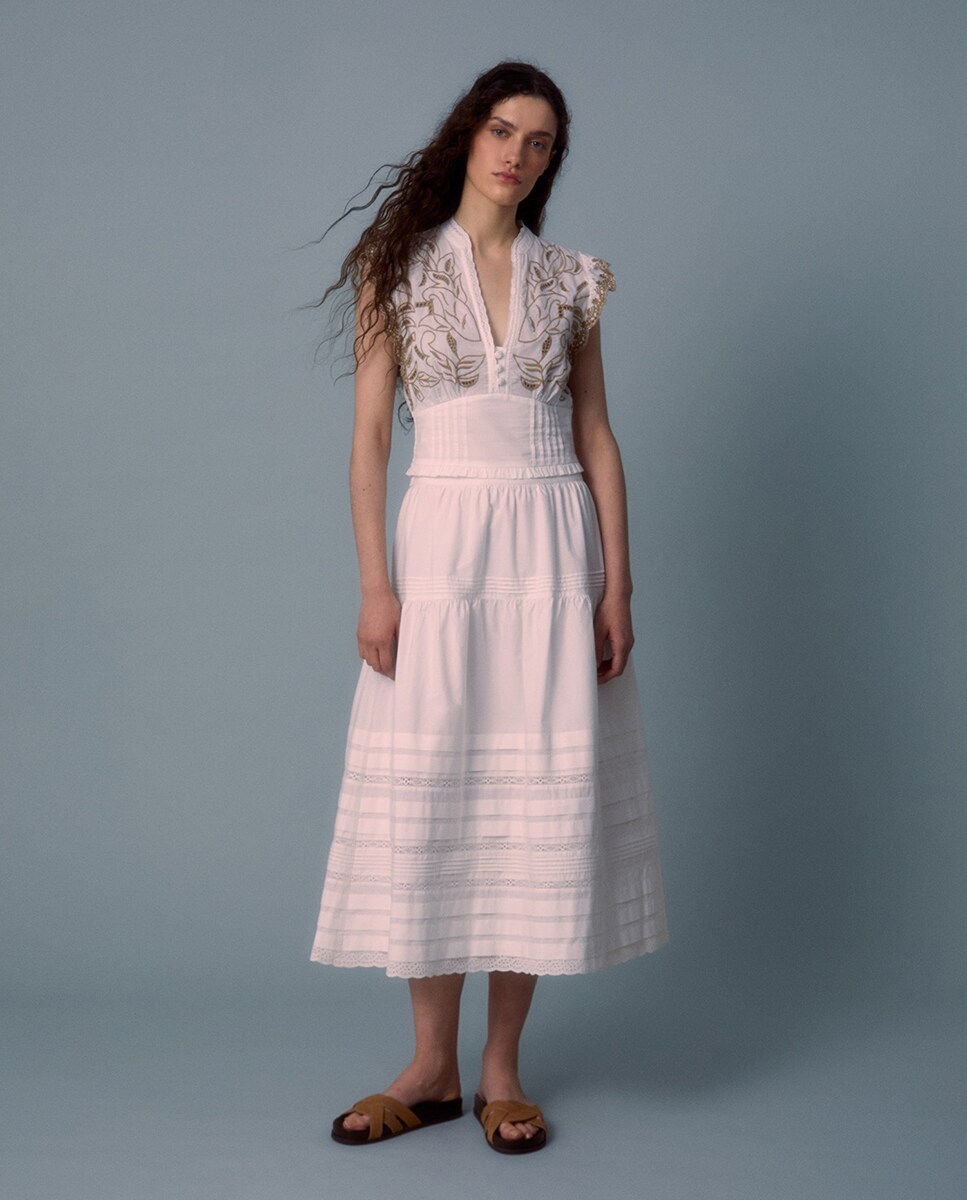• Falda midi de vuelo en 100% algodón con detalle de cintas y cortes