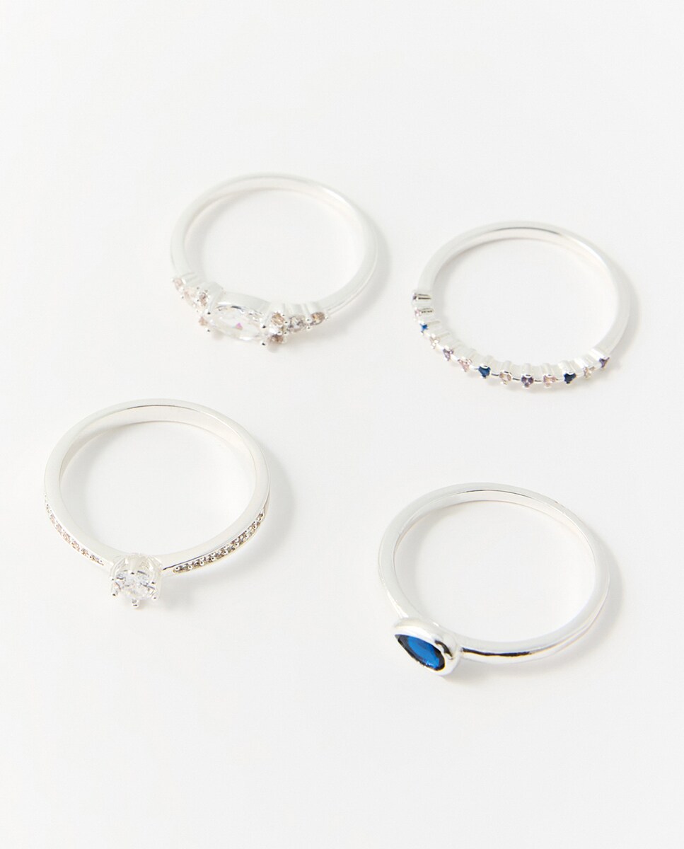 • Set de 4 anillos plateados con detalle de pedrería