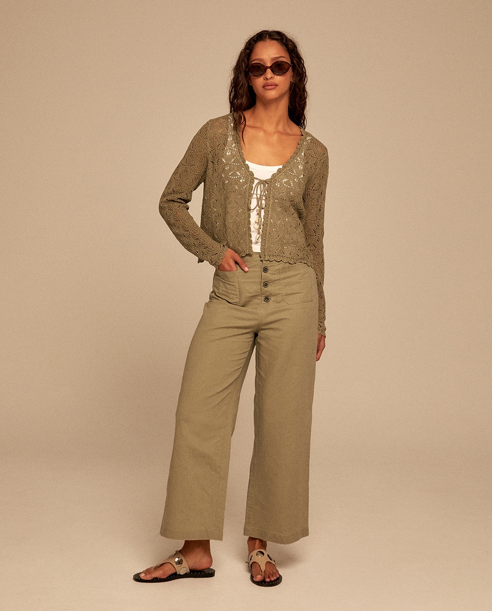 • Pantalón recto con pernera amplia y cierre de botones frontal